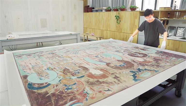 將畫作噴濕、刷上糨糊、覆上紙、刷平、上墻全色……7年里,徐喆在周而復(fù)始的工序里與作者對(duì)話,在時(shí)間的長(zhǎng)河里,感受歷史的厚重和精彩。
