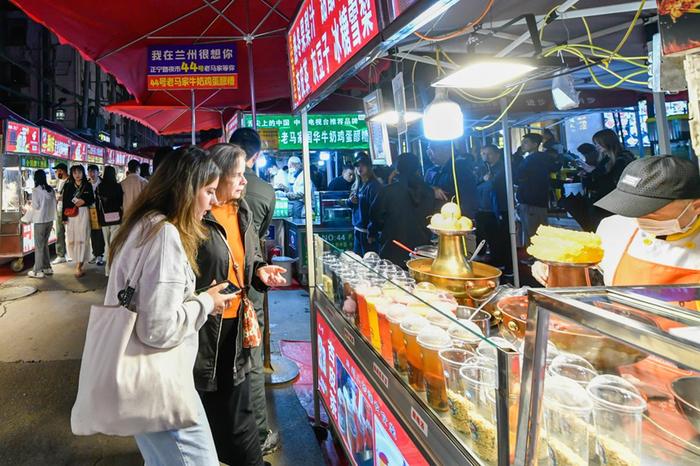 游客在蘭州市城關(guān)區(qū)正寧路小吃夜市選購(gòu)特色美食。新華社記者 郎兵兵 攝