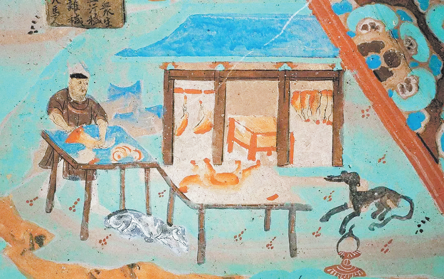 提起西北的美食,就少不了肥美牛羊肉。畜牧業(yè)發(fā)達(dá)的敦煌,這些優(yōu)質(zhì)的肉類絕不會斷貨。莫高窟第61窟、第85窟、第156窟等,都出現(xiàn)了“肉鋪”的場面。
