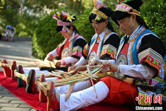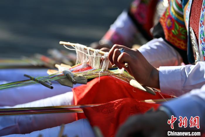 9月26日,甘肅省甘南藏族自治州舟曲縣,當(dāng)?shù)夭刈鍕D女紡織錦帶吸引游人駐足觀賞。錦帶是舟曲藏族婦女用以束腰、扎靴、攏發(fā)乃至點(diǎn)綴服飾的花帶子,艷麗多彩、圖案優(yōu)美。每逢吉慶節(jié)日,藏族婦女穿戴的華麗盛裝就需要少則五、六條,多則十幾條寬窄長短相宜的錦帶來裝飾。據(jù)介紹,藏族織錦帶技藝歷史悠久,一千多年以前,古羌族和吐蕃已有了較發(fā)達(dá)的手工編織技術(shù),在艱難的生活條件下對服飾等生活用品除實(shí)用功能之外,已經(jīng)有了強(qiáng)烈的審美追求,是研究舟曲羌藏文化的“活化石”。中新社記者 九美旦增 攝