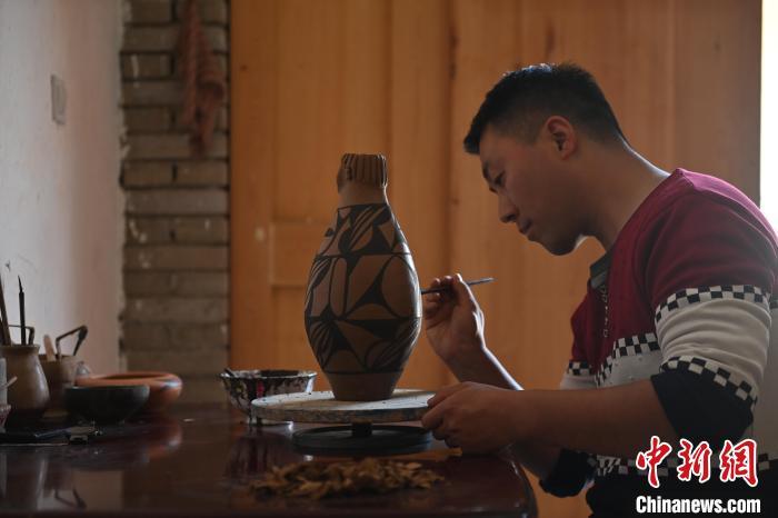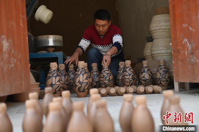 4月11日,甘肅省天水市秦安縣康坡村陶藝車間內(nèi),甘肅省級非物質(zhì)文化遺產(chǎn)名錄秦安陶器燒制技藝天水市級傳承人康曉龍趕制大地灣文創(chuàng)彩陶。李亞龍 攝