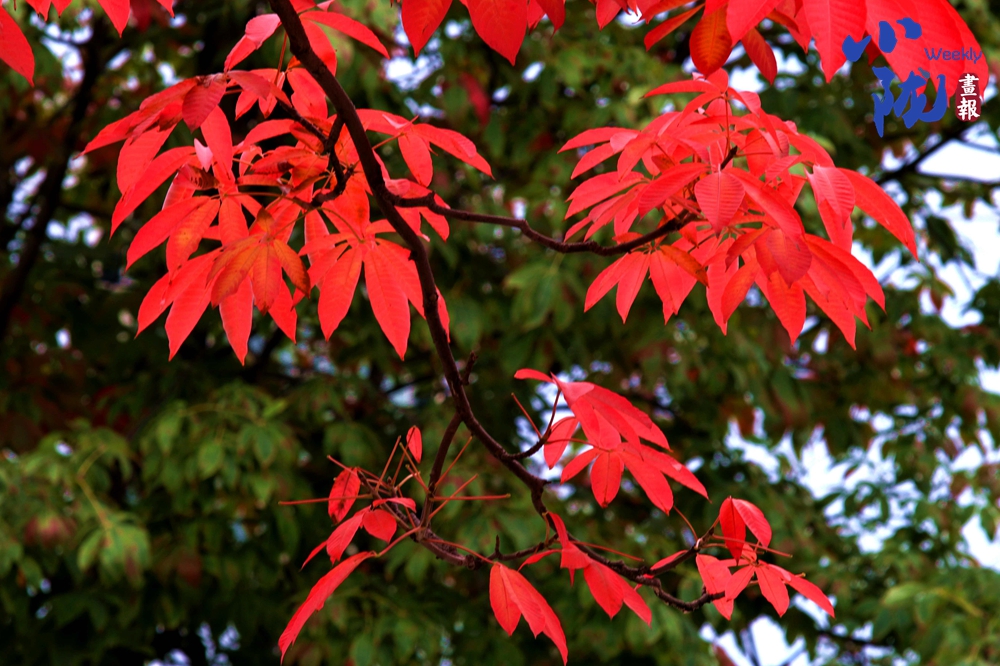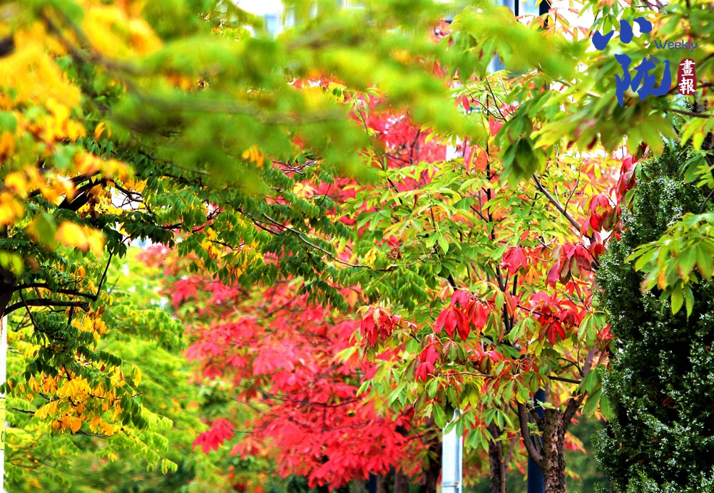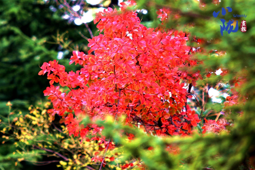 淡淡的秋霜將樹葉染成綺麗多彩的鮮紅和金黃,與綠葉共舞,層層疊疊,在凋零中展現(xiàn)生命的堅(jiān)韌。