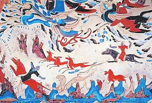 在莫高窟第249窟壁畫中有一幅“行獵圖”:畫面上都是些體型巨大的動(dòng)物,有體態(tài)矯健的猛虎、疾馳俊逸的鹿群、整裝待發(fā)的獅子等,有在奔馳的駿馬上拈弓搭箭窮追不舍的獵人,還有在飛奔的駿馬上淡定轉(zhuǎn)身從容射虎的獵人。整個(gè)畫面既緊張又美好,使人不由得對(duì)畫師精湛的技藝心悅誠(chéng)服。唐代詩(shī)人王維在詩(shī)作《觀獵》中寫道:“風(fēng)勁角弓鳴,將軍獵渭城。草枯鷹眼疾,雪盡馬蹄輕。忽過(guò)新豐市,還歸細(xì)柳營(yíng)?;乜瓷涞裉?,千里暮云平。”意思是說(shuō)將軍的獵騎,飛馳在渭城的近郊。風(fēng)中傳來(lái)呼嘯的弦聲。已枯的野草,擋不住尖銳敏捷的鷹眼,積雪后飛馳的駿馬馬蹄會(huì)愈加輕盈。據(jù)文獻(xiàn)記載,唐宋時(shí)期人們打獵時(shí)多有一種“西北望,射天狼”的豪情!在莫高窟第85窟壁畫中還有一幅“行獵圖”就形象地反映了唐人狩獵的情景:畫面上的四個(gè)健碩獵人正在整裝出獵,他們著裝統(tǒng)一:頭戴幞頭,身穿缺胯衫,足蹬半腰靴。打獵的裝備也很不同:有人胳臂上架鷹、有人單手牽犬、有人持弓挎箭囊,甚至還有一人手持利斧。