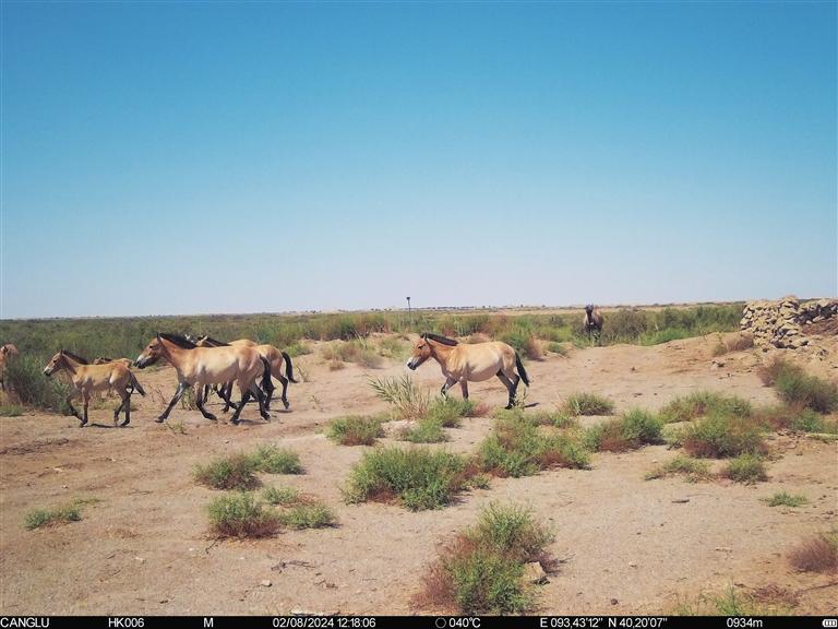 畫面中,普氏野馬在廣闊的灌草地上自由覓食、馳騁嬉戲。不遠處,野駱駝高大的身軀在荒漠背景下顯得堅毅而神秘,緩慢而沉穩(wěn)的步伐踏出了對這片土地的深深眷戀。兩者雖習(xí)性各異、棲息地有所不同,但在這方天地里和諧共處,構(gòu)成了獨特的生態(tài)景觀。
