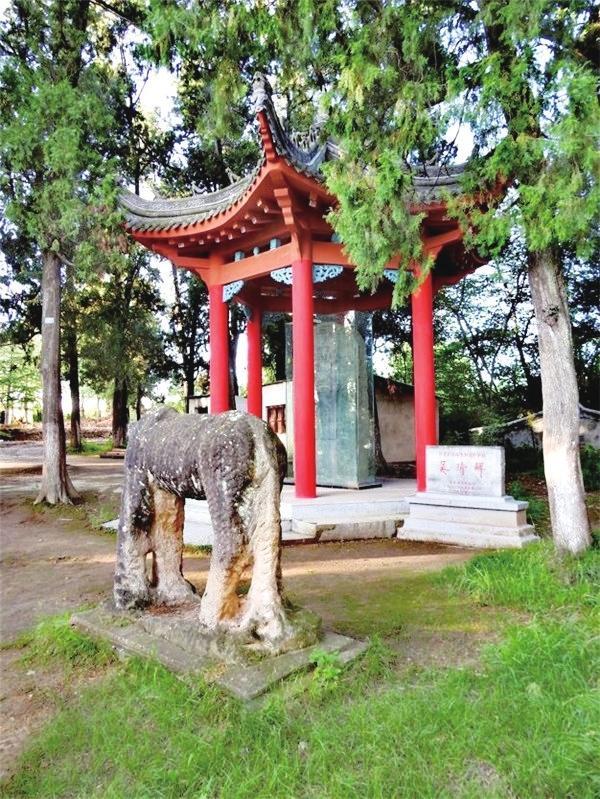 到達山頂?shù)膮谦d墓,眼前出現(xiàn)的是兩尊相向而立高大的宋代石人,石人的不遠處是一對相互對望的石馬。在這兩匹宋代高大石馬的后面,是一個由六根朱紅色木柱擎起的六角亭。亭子里一塊石碑矗立其間,碑上刻著 “宋故開府吳公墓志銘”。