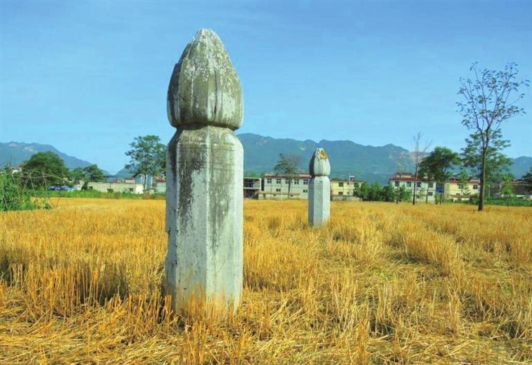 平闊的川地,村人已把一地莊稼收入自己殷實(shí)的谷倉(cāng),田野涂遍了陽(yáng)光的顏色。遠(yuǎn)遠(yuǎn)地,我們就看見一座有兩尊八楞蓮苞頭華表矗立在田野之間,在另一塊地里,還有一個(gè)僅裸露肩膀于地表、頭顱已缺失的石翁仲,圓領(lǐng)官服、胸垂綬帶的文官裝束隱約可見……