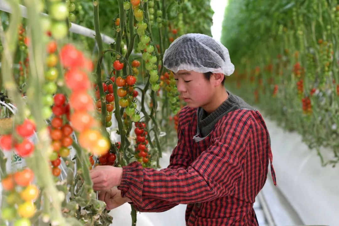 在古浪縣黃花灘生態(tài)移民區(qū)富民新村現(xiàn)代化智能玻璃溫室,村民在管護番茄 范培珅 攝