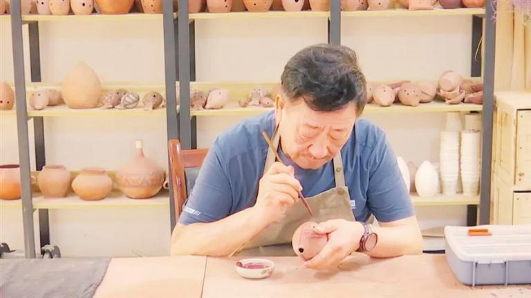 傳承人關(guān)振國(guó)在完成玉門(mén)陶塤的彩繪環(huán)節(jié)。