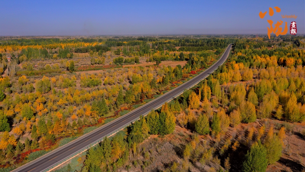 公路沿線成片的五彩林艷麗迷人,與藍(lán)天、荒漠共同勾勒出一幅色彩動(dòng)人的生態(tài)畫卷。