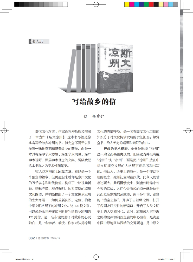 閱讀徐兆壽寫給故鄉(xiāng)的帶著滾燙體溫的126封信,總是給人一種澎湃的激情和磅礴的力量,總是讓人思接千載、視通萬里。《斯文涼州》立足絲綢之路和中華文明的歷史格局,提出了重構(gòu)涼州文化的宏大愿望,讓讀者深刻認識到,徐兆壽的故鄉(xiāng)涼州,不單單是他日夜眷戀的熱土,而是打破了行政區(qū)劃的大地理概念,更是中華民族共同的文化符號和精神歸宿。在建設(shè)中華民族現(xiàn)代文明的今天,我們應(yīng)當全面了解、認識、重構(gòu)涼州文化,真正做到創(chuàng)造性轉(zhuǎn)化、創(chuàng)新性發(fā)展。認識了這本書的價值,也就認識了作者的價值,徐兆壽不僅是一位優(yōu)秀的文化學(xué)者、教授、作家,而且也是一位有智慧、有見地的歷史學(xué)家。