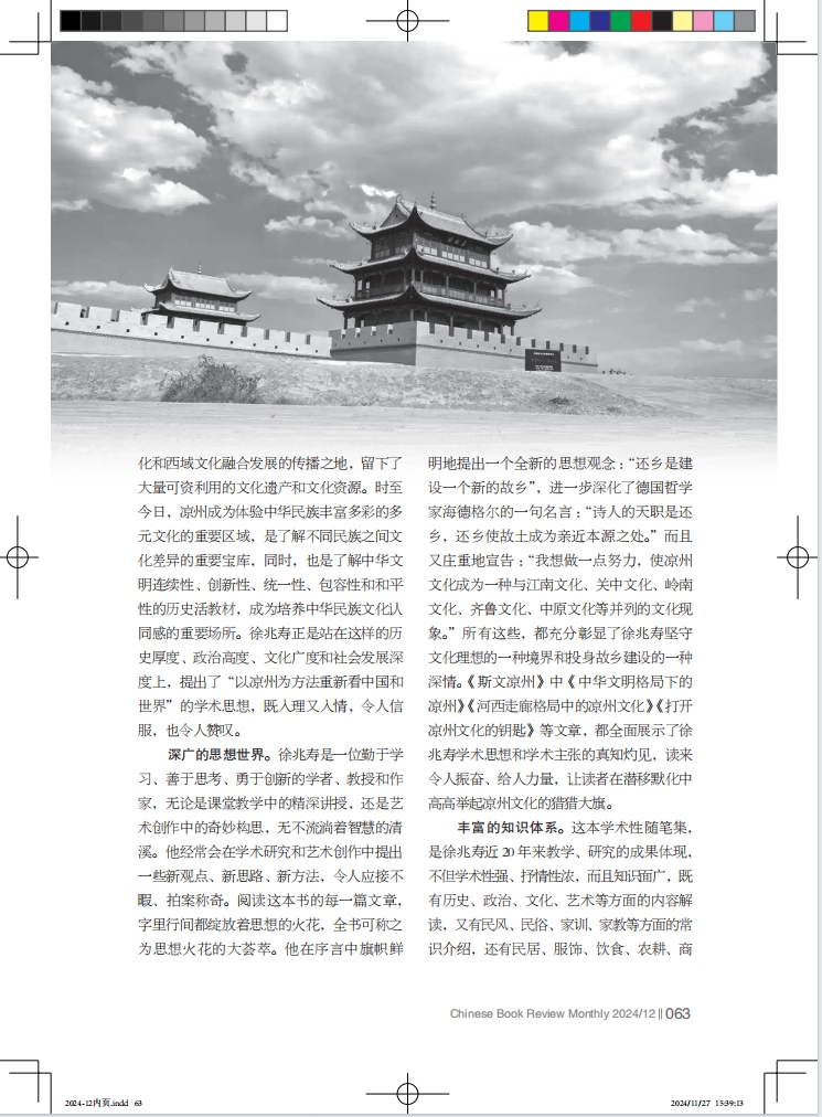 收入這本書的126篇文章,看似是一個個獨立的篇章,但貫通起來看卻是涼州文化的萬千姿態(tài)和時代價值,構(gòu)成了一部視角新穎、邏輯嚴謹、觀點鮮明、體系完整的涼州文化圖譜,并響亮提出了一個文化傳承發(fā)展的宏大命題——如何重新認識、定位、構(gòu)建中華文明格局下的涼州文化。這 126 篇文章,可以說是徐兆壽連續(xù)不斷地寫給故鄉(xiāng)涼州的126封信,是一名赤誠的游子對故鄉(xiāng)的心靈獨白,是一名學(xué)者、教授、作家對弘揚涼州文化的真情呼喚,是一名有高度文化自信的知識分子對文化傳承發(fā)展的責任擔當??v覽全書,給人無窮的遐思和無限的向往。