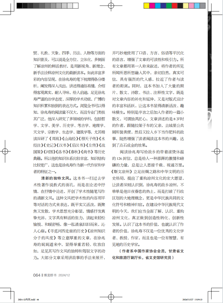 豐富的知識體系。這本學(xué)術(shù)性隨筆集,是徐兆壽近20年來教學(xué)、研究的成果體現(xiàn),不但學(xué)術(shù)性強、抒情性濃,而且知識面廣,既有歷史、政治、文化、藝術(shù)等方面的內(nèi)容解讀,又有民風(fēng)、民俗、家訓(xùn)、家教等方面的常識介紹,還有民居、服飾、飲食、農(nóng)耕、商貿(mào)、禮教、天象、四季、歷法、人物等方面的知識普及,可以說是全方位、立體化、多側(cè)面了解涼州的鮮活教材,是用新視角、新理念、新手法詮釋涼州文化的最新讀本。如此豐富多彩的內(nèi)容呈現(xiàn),在徐兆壽的筆下梳理得條分縷析,闡發(fā)得深入淺出,講述得通俗易懂,介紹得客觀真實,耐人尋味,給人啟迪,足見徐兆壽嚴謹?shù)闹螌W(xué)態(tài)度、深厚的學(xué)術(shù)功底、廣博的知識積累和獨到的表達方式。瀏覽全書可以得知,徐兆壽的閱讀量不僅大,而且專業(yè)門類極其廣泛,他深入研究了多領(lǐng)域的學(xué)科,包括哲學(xué)、文學(xué)、美學(xué)、歷史學(xué)、考古學(xué)、地理學(xué)、天文學(xué)、宗教學(xué)、生態(tài)學(xué)、建筑學(xué)等,尤其精讀深研了《周易》《山海經(jīng)》《穆天子傳》《水經(jīng)注》《史記》《漢書》《后漢書》《左傳》《戰(zhàn)國策》《河圖》《洛書》《春秋》《尚書》等歷史典籍。所以他的知識體系比較豐富,知識結(jié)構(gòu)比較寬廣,這也是徐兆壽作為新一代作家和學(xué)者的特征之一。
