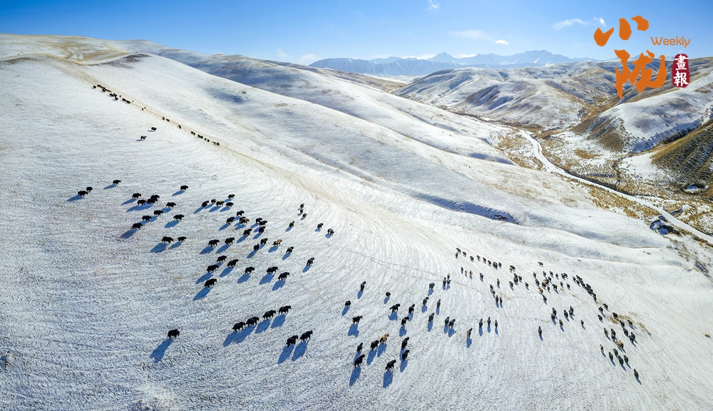 牛群在雪地中悠閑地覓食,和雪景相映成趣,給這片寧靜的草原帶來了生機(jī)與活力。
