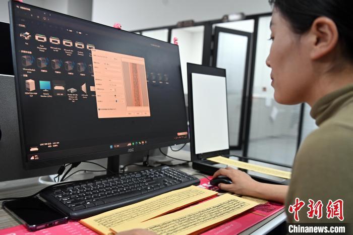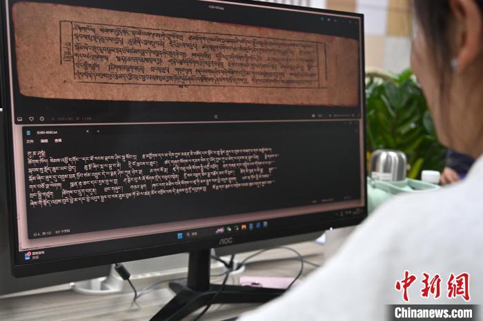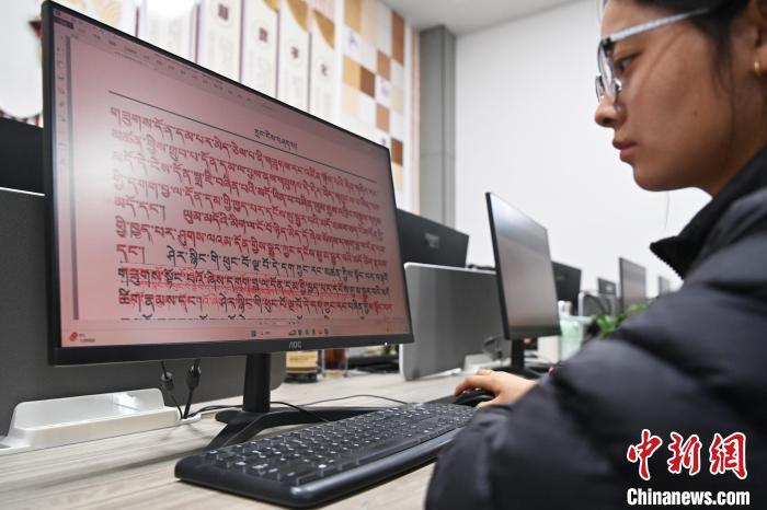 2月27日,在甘肅甘南藏族自治州碌曲縣益西達(dá)吉科技有限公司內(nèi),工作人員正在進(jìn)行藏文古籍?dāng)?shù)字化相關(guān)工作。該公司主要從事民族古籍?dāng)?shù)字化建設(shè)和古籍文獻(xiàn)數(shù)據(jù)庫建設(shè),自2019年以來,承擔(dān)西藏、四川、甘肅等省區(qū)的藏文古籍?dāng)?shù)字化項(xiàng)目。圖為工作人員用該公司研發(fā)的藏文信息處理系統(tǒng)對(duì)古籍?dāng)?shù)字化內(nèi)容進(jìn)行檢查。中新社記者 九美旦增 攝