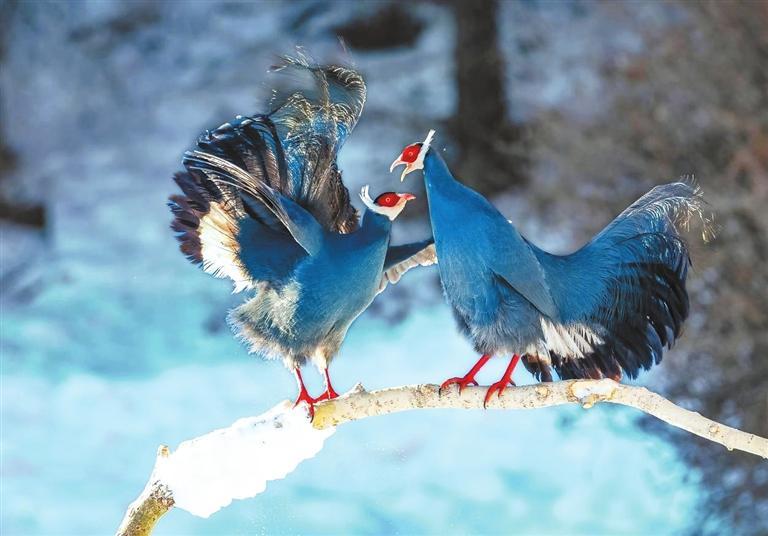 藍(lán)馬雞是珍稀名貴的禽類(lèi),頭側(cè)緋紅,耳羽簇白色、突出于頸部頂上,通體藍(lán)灰色,中央尾羽特長(zhǎng)而翹起,尾羽披散下垂如馬尾,故名藍(lán)馬雞。冬日里,藍(lán)馬雞成群飛落山腳覓食,藍(lán)羽丹頂行走在雪地上格外搶眼。數(shù)量繁多的藍(lán)馬雞是祁連山野生山地雞的“顏值擔(dān)當(dāng)”。覓食時(shí),藍(lán)馬雞常用爪刨挖林中空地苔蘚和林緣草地,尋找掉落的云杉種子。刨食的過(guò)程會(huì)讓土壤松動(dòng),便于種子生根發(fā)芽,促進(jìn)林區(qū)植物天然更新。
