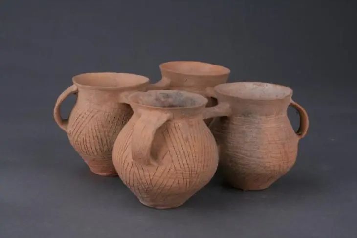 出土刻劃紋單耳四聯(lián)罐(鎮(zhèn)原縣博物館藏)
