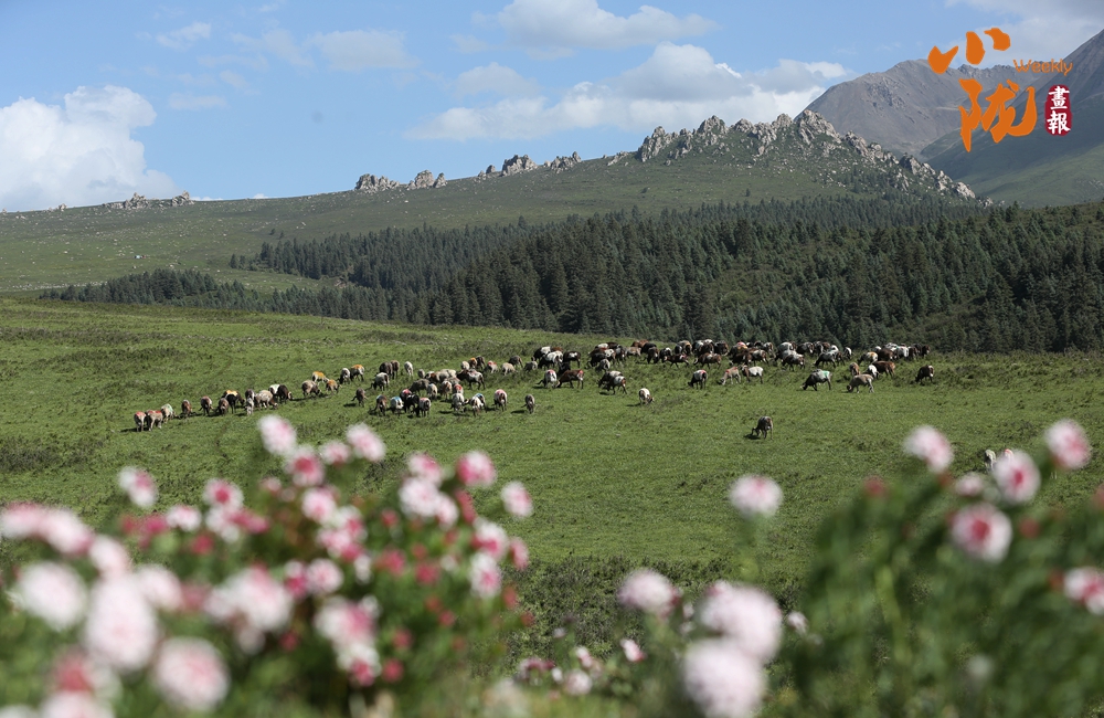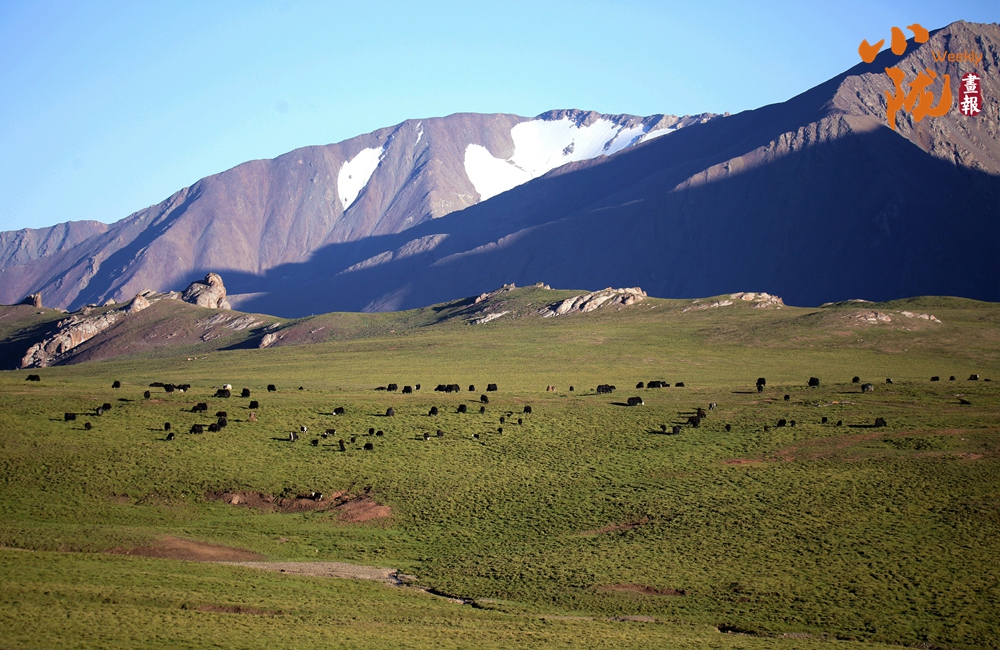 初夏時(shí)節(jié),祁連山國(guó)家公園張掖肅南縣境內(nèi),天空湛藍(lán)如洗,草原碧綠廣闊,巍峨的雪山仿佛插入云端,牛羊在青草中覓食,勾勒出一幅天然秀麗的生態(tài)畫卷。