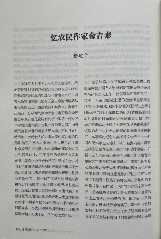 由于缺席,心中充滿了對金老先生的深深歉意。而令人欣慰的是在出版座談會(huì)召開后的第二天上午,金雷泉就向我送來了甘肅少年兒童出版社出版的金吉泰童話精品叢書,《頭戴水珠的小杉苗》《沒牙三弦琴》《銅環(huán)兄弟》《小蜜蜂偵察記》《青蛙借雷聲》5本圖書的封面顏色,分別由赤、橙、黃、綠、藍(lán)組成,詮釋了金老先生多彩的軌跡和繽紛的人生。更令人驚喜的是金雷泉還送來了一本厚厚的紀(jì)念文集《為文學(xué)而生——中國農(nóng)民作家金吉泰》,從書名到內(nèi)容,都高度凝練了金老先生一生的信仰追求和奮斗歷程,這6本圖書比較全面地展示出了金老先生的文學(xué)成果和精神圖譜。手捧著沉甸甸的這些圖書,金老先生笑瞇瞇的慈祥面容又浮現(xiàn)在眼前,我向金雷泉脫口而出:“你父親真了不起?。∧阕盍私饽愀赣H,又是他把你培養(yǎng)成為一名作家,你應(yīng)當(dāng)為你父親寫一本書,書名就叫《我的父親金吉泰》。”金雷泉一邊點(diǎn)著頭,一邊若有所思地說道:“父親去世后,就像把我的魂丟了,第一年什么都沒寫,也不敢寫,第二年才開始零零星星地寫了點(diǎn)父親與有關(guān)報(bào)刊的交往和情緣,還寫了點(diǎn)父親在生活和寫作中的軼事趣聞。您的建議非常好,我擔(dān)心駕馭不好,試試看吧。”我感覺金雷泉有點(diǎn)為難,馬上又安慰他:“不急,你用兩三年時(shí)間慢慢寫。”