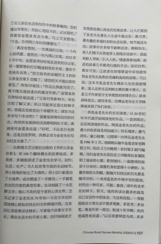 由敦煌文藝出版社出版的《我的父親金吉泰》,有108個(gè)趣味橫生的故事組成,多角度、多側(cè)面講述了金老先生學(xué)習(xí)、創(chuàng)作、生活、生產(chǎn)、為人處世等方面的生動(dòng)細(xì)節(jié),用小視角折射出了大情懷,用小切口彰顯出了大境界,成功塑造了一手耕田、一手握筆的農(nóng)民作家的典型形象,生動(dòng)刻畫了一生沉醉文學(xué)、癡心不改的堅(jiān)守者的心靈世界,忠實(shí)記錄了金老先生70年如一日在文學(xué)創(chuàng)作園地精心耕耘的快樂時(shí)光和輝煌歷程。這本回憶錄故事講述精彩,盡管每個(gè)故事文字不長,看似生活中的平常小事,但仔細(xì)閱讀才發(fā)現(xiàn)都是精心篩選的經(jīng)典故事,讓人們看到了金老先生漫長人生途中最出彩、最可貴、最有趣的幸福時(shí)刻和生活場景。細(xì)節(jié)描述生動(dòng),故事中許多細(xì)節(jié)新鮮活潑、栩栩如生,將人們情不自禁地帶入到現(xiàn)實(shí)場面中,讀起來耐人尋味、引人入勝。情感真摯飽滿,敘述的故事幾乎都用白描的手法,親切自然,真實(shí)可信,讓讀者在深情厚誼中深刻感悟到金老先生高貴的靈魂和高尚的品格。可以說,這本書是金老先生精彩人生的高度縮影,是人品和文品相映生輝的集中展示,也是父子作家堅(jiān)守文學(xué)理想的深情告白,讀來韻味悠長,感同身受,仿佛金老先生又笑瞇瞇地來到了我們身旁。