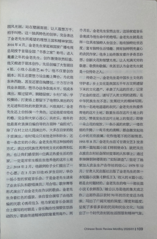 從此之后,我與金老先生的交往越來越密切,交流的話題也越來越廣泛,每次見面,他給我最多的就是鼓勵(lì):“小楊啊,你在《人民日報(bào)》上發(fā)表的寫奧運(yùn)會(huì)的散文,看得我都激動(dòng)了。”“小楊啊,《詩刊》上發(fā)表大作了,值得祝賀!”“小楊啊,你的創(chuàng)作達(dá)到了新的水準(zhǔn),都登上國刊《人民文學(xué)》了。”有一次,金老先生得知我在《星星》詩刊舉辦的首屆農(nóng)民工詩歌大獎(jiǎng)賽中獲獎(jiǎng)的消息后,專門打來電話:“小楊啊,向你表示祝賀,你的獲獎(jiǎng)作品表達(dá)了我們農(nóng)民工的心聲!”金老先生與人相處,傳遞的絕對是正能量,從我與他交往的30多年時(shí)光里,從來沒有聽到過他非議別人。后來才慢慢發(fā)現(xiàn),他有與眾不同的精神境界、質(zhì)樸品格、為人方式和處事態(tài)度,他靈魂深處永遠(yuǎn)流淌著向善、向上、向真、向美的價(jià)值取向,渾身上下始終洋溢著執(zhí)著、豁達(dá)、樂觀、寬容的人格魅力。一個(gè)地地道道的農(nóng)民,從當(dāng)年只有小學(xué)文化程度,靠勤奮自學(xué)70年堅(jiān)持筆耕不輟,出版各種作品集25部,共計(jì)400多萬字,被中共甘肅省委、甘肅省人民政府授予“甘肅省文藝終身成就獎(jiǎng)”。對一個(gè)農(nóng)民來說,這在全國也是屈指可數(shù)的。年近80歲的時(shí)候,在患嚴(yán)重眼疾幾乎導(dǎo)致雙目失明的情況下,每天堅(jiān)持寫作兩三千字,用10個(gè)月時(shí)間,完成了45萬字的長篇小說《農(nóng)耕圖》,榮獲甘肅省文學(xué)藝術(shù)類政府最高獎(jiǎng)——敦煌文藝獎(jiǎng),金老先生的頑強(qiáng)毅力和拼命勁頭也是罕見的。20世紀(jì)80年代初,他以家鄉(xiāng)榆中縣金崖鄉(xiāng)文化站為依托,創(chuàng)辦了全省第一個(gè)農(nóng)民文學(xué)社——苑川文學(xué)社,舉辦“文學(xué)創(chuàng)作講習(xí)班”,吸引方圓村鎮(zhèn)100多名“泥腿子”文學(xué)愛好者參與其中,每當(dāng)經(jīng)他修改、推薦的作品發(fā)表后,年過半百的他總是騎上自行車跑幾十公里路,喜滋滋地將樣報(bào)樣刊送到作者手里,金老先生樂此不疲為文學(xué)愛好者全方位服務(wù)的情懷,在當(dāng)下是不多見的,更加顯得彌足珍貴。興趣廣泛的金老先生在晚年時(shí)突發(fā)奇想,在老宅院子里啟動(dòng)了家庭美化工程,自己設(shè)計(jì)、自己施工,在自家院子西墻上,用五顏六色的小石子創(chuàng)作了一幅長八米、寬二米的巨型壁畫,畫面上有紅日、山水、碌碡、西瓜、樹木、小鹿、大雁、人物,還有太陽灶、飛機(jī)、衛(wèi)星,好一幅天人合一的田園風(fēng)光畫。站在壁畫面前,讓人遐想萬千、拍手叫絕,這一獨(dú)具特色的創(chuàng)舉,完全表達(dá)了金老先生所渴望的理想王國和精神家園。2014年4月,金老先生家庭被國家廣播電視總局授予首屆全國“書香之家”稱號。進(jìn)入耄耋之年的金老先生,創(chuàng)作激情依然旺盛,他又癡迷于劇本創(chuàng)作,先后創(chuàng)編了大型劇目4部,小戲小品曲藝46個(gè)。他不僅要?jiǎng)?chuàng)作劇本,而且還要想方設(shè)法搬上舞臺(tái)。為此他東奔西跑,甚至還要自掏腰包,千方百計(jì)尋找業(yè)余劇團(tuán),想盡辦法爭取高水平、低成本演出。雁過留聲,腳踏留痕,鄉(xiāng)村廣場、學(xué)校操場、打麥場上都留下了他帶隊(duì)演出的閃光足跡和百姓的歡歌笑語。興致高時(shí),金老先生還上臺(tái)扮演一個(gè)角色,過足他愛戲唱戲的癮,完全和大家心連心、共歡樂。晚年的他最喜歡表演自編自導(dǎo)的古劇種“扁擔(dān)戲”,除了在村上幼兒園演出外,大多在自家的院子里演出,有時(shí)觀眾只有他老伴和孫女,還有一條忠實(shí)的小狗。金老先生用這種獨(dú)特的方式,表達(dá)對民族優(yōu)秀傳統(tǒng)文化的敬畏和弘揚(yáng),也讓我們感受到一位真正熱愛生活的作家,一定是牢牢生根在生他養(yǎng)他的這片土地上。2018年2月,他破例給子女們提出了一個(gè)心愿,在3月25日他85歲生日時(shí),舉辦一場小型的家庭音樂會(huì)。于是金老先生請來了業(yè)余樂隊(duì)和歌唱演員,用合唱、歌伴舞等形式演出了由金老先生作詞的歌曲。金老先生身著紅色的盛裝,親自登臺(tái)演唱了由他改編的民歌《繡荷包》。他為家庭音樂會(huì)演出臺(tái)上撰寫的對聯(lián)是:音樂陶冶性情管弦悠揚(yáng)動(dòng)四方,歌曲傳遞精神國歌隆重傳海外。兩個(gè)月后,金老先生安然去世,這場家庭音樂會(huì)竟成為他生命中的絕唱。金老先生就是這樣一位具有獨(dú)特人生信念、抱有獨(dú)特處世態(tài)度、富有獨(dú)特生活情趣、擁有獨(dú)特明亮童心的農(nóng)民作家,他身上始終散發(fā)著許多奇思妙想、創(chuàng)新火花和智慧光亮,讓人充滿無窮的敬意、敬畏和敬佩,我甚至認(rèn)為金老先生就是一位傳奇之人。