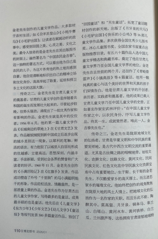 傳奇之二,金老先生是甘肅兒童文學(xué)的奠基者。甘肅的兒童文學(xué)創(chuàng)作是伴隨著共和國的誕生而發(fā)展壯大起來的,盡管起步較晚,但勢頭強(qiáng)勁,涌現(xiàn)出了一批優(yōu)秀作家和有影響的作品,金老先生就是其中的佼佼者。1956年6月,他的第一篇兒童文學(xué)作品《長城南邊的草地上》在《甘肅文藝》發(fā)表,作品敏銳捕捉到新中國成立后逐步出現(xiàn)的城鄉(xiāng)差別這一現(xiàn)象,以犀利的筆觸、鮮活的語言,有力批駁了以城里人自居而形成的優(yōu)越感,立意高遠(yuǎn),思想深刻,內(nèi)涵豐富,手法新穎,受到社會(huì)各界的贊譽(yù)和廣大讀者的好評。1960年11月,金老先生創(chuàng)作的《小滿歷險(xiǎn)記》在《紅旗手》發(fā)表,作品成功塑造了外號“千里駒”的馬小滿聰明能干的形象,作品輕松活潑,情趣盎然,是一部質(zhì)量上乘的作品。金老先生作為甘肅杰出的兒童文學(xué)作家,寫得最多的是童話,成果最豐碩的也是童話。他先后在《兒童文學(xué)》《東方少年》《少年文藝》《幼兒文學(xué)》《童話報(bào)》等報(bào)刊發(fā)表300多篇童話作品,獨(dú)創(chuàng)了“田園童話”和“天生童話”,拓寬了童話題材創(chuàng)作的新天地,出版了《月牙泉的天馬》《小毛驢出國》《快樂的小公雞》等16部兒童文學(xué)作品集,多次獲得全國優(yōu)秀少兒圖書獎(jiǎng)、冰心兒童圖書獎(jiǎng)、全國農(nóng)家書屋重點(diǎn)出版物推薦目錄,有五六十篇作品入選中國兒童文學(xué)精選和典藏書庫,奠定了他在甘肅兒童文學(xué)界乃至全國兒童文學(xué)界的地位。金老先生在去世前的兩個(gè)月,還創(chuàng)作了《青蛙借雷聲》《小鎮(zhèn)典故》等6篇童話,他用一顆純真的童心與這個(gè)美好的世界和天真的孩子們深情告白。他是甘肅兒童文學(xué)的開創(chuàng)者、親歷者、實(shí)踐者和奠基者,他的成果已載入甘肅兒童文學(xué)乃至中國兒童文學(xué)的史冊,正如著名作家安武林評價(jià):“在中國兒童文學(xué)作家之中,以農(nóng)民身份,抒寫兒童文學(xué)作品,終其一生,成就斐然者,唯此一人,金吉泰先生也。”