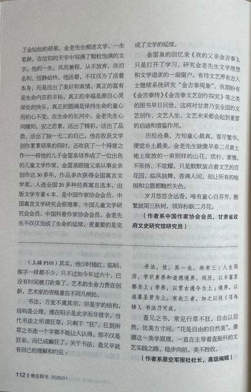 金雷泉的回憶錄《我的父親金吉泰》,只是打開了學(xué)習(xí)、研究金老先生文學(xué)理想和文學(xué)追求的一扇窗戶,有待文藝界有志人士繼續(xù)系統(tǒng)研究“金吉泰現(xiàn)象”。我期盼有《金吉泰傳》《金吉泰文藝創(chuàng)作探究》等之類的圖書早日問世,這將對甘肅乃至全國的文藝創(chuàng)作、文藝人生、文藝未來都會(huì)起到重要的啟迪和借鑒作用。