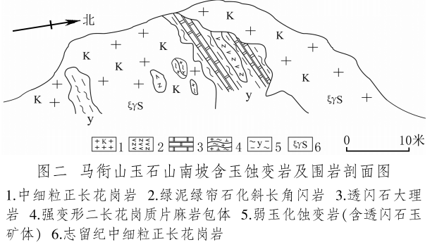 馬銜山玉礦分布在馬銜山東南部的玉石山(圖版一),海拔3028米。山上出露的地質(zhì)體主要為古元古界馬銜山巖群、中元古代片麻二長(zhǎng)花崗質(zhì)巖[3]和志留紀(jì)正長(zhǎng)花崗巖及正長(zhǎng)巖。馬銜山巖群的巖性為黑云斜長(zhǎng)片麻巖、變粒巖、斜長(zhǎng)角閃巖和白云質(zhì)大理巖,巖石普遍遭受了韌性變形,變余糜稜?zhēng)r發(fā)育。志留紀(jì)巖漿侵入期后熱液活動(dòng)較強(qiáng),石英脈細(xì)脈發(fā)育,局部見螢石礦化或礦床[4]。玉礦化主要產(chǎn)于馬銜山巖群與志留紀(jì)正長(zhǎng)花崗巖和正長(zhǎng)巖接觸帶上(圖版二),具體賦存在與白云質(zhì)大理巖的接觸部位,是正長(zhǎng)花崗巖及正長(zhǎng)巖與鎂質(zhì)大理巖接觸交代蝕變的產(chǎn)物[5]?;◢弾r與片麻巖、變粒巖和斜長(zhǎng)角閃巖接觸界線附近巖石雖有蝕變,但不見玉化蝕變巖或玉石出露。在近山頂開采玉石揭露的一個(gè)地質(zhì)剖面清晰地顯示了這些特征(圖二)。該剖面大致呈東西走向,長(zhǎng)約50米,馬銜山巖群多呈殘留體出露,斜長(zhǎng)角閃巖綠泥綠簾石化強(qiáng)烈,大理巖普遍發(fā)生蝕變,形成透輝透閃石大理巖,緊靠花崗巖接觸地帶發(fā)育窄窄的透閃石玉礦帶?,F(xiàn)在人們找玉,也主要在該剖面上的花崗巖和鎂質(zhì)大理巖的接觸帶上鑿洞,在接觸帶上見有多處采挖玉石的洞穴。在該剖面西側(cè)約50米,發(fā)育有正長(zhǎng)巖與大理巖的混染帶,肉紅色正長(zhǎng)巖中包裹混染著大量灰綠色透閃透輝大理巖,部分已蝕變?yōu)橥搁W透輝石巖,且質(zhì)地較細(xì)膩,成為半玉化巖石。剖面和周圍地質(zhì)特征表明,玉礦的形成是早古生代志留紀(jì)花崗質(zhì)雜巖體侵入到古元古代鎂質(zhì)大理巖,發(fā)生接觸交代蝕變作用的結(jié)果,在兩種巖石接觸帶形成玉礦體。但并不是蝕變帶中的巖石都是透閃石玉石,透閃石玉在蝕變帶中多呈雞窩狀或不規(guī)則狀分布,少量呈脈狀出露。從剖面及部分采坑的規(guī)模來看,玉礦體向深處有變大、變好的趨勢(shì),這主要受控于接觸面產(chǎn)狀,在傾角較緩處礦體相對(duì)較大。橫向上在背離接觸面方向圍巖具有從透閃石玉到透閃透輝石玉、透閃透輝石大理巖再到含透閃石大理巖的變化特征,反映了交代蝕變強(qiáng)度與接觸帶溫度及熱液成分變化的密切關(guān)系。從玉礦體到蝕變圍巖由于成分和結(jié)構(gòu)的變化出現(xiàn)一系列不同類型的玉石或巖石。我們?cè)谄拭嫔喜杉揭恍┬K的淡綠色玉料(圖版三)和出露較寬的微晶大理巖,經(jīng)偏光顯微鏡下薄片鑒定和XRF檢測(cè),確定有透閃石玉、透輝透閃玉、透閃透輝石玉、透閃透輝石大理巖和含透閃石大理巖等,這與馬家窯遺址出土的齊家文化時(shí)期大部分玉質(zhì)品玉料類型基本一致[6]。部分地段近礦圍巖還有透輝石巖、透輝矽卡巖、矽卡巖化大理巖、蛇紋石化大理巖、斜長(zhǎng)透輝石巖等。玉石山的采洞(坑)由于資源與環(huán)境保護(hù)的要求,大多已被填埋,但仍可見采坑殘留的位置。采洞(坑)均位于大理巖與正長(zhǎng)花崗巖接觸帶靠近大理巖一側(cè),這也間接顯示了玉礦體的位置。此外,玉石山花崗巖中石英細(xì)脈較發(fā)育,局部可見螢石礦化,反映了花崗巖侵入期后低溫?zé)嵋夯顒?dòng)仍較強(qiáng),對(duì)玉礦也有一定的改造影響。