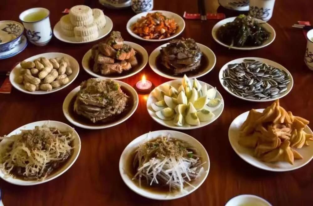 ——十二個佐酒碟子,皆取材自黃土田園,寓意十二地支,天人合一;擺放法為左骨、右旋,左雞、右肝,左十香、右苴列,左鹿角、右?guī)Ыz,上花生、下瓜子,左上角紅爐、右下角白爐,中間為全盤。