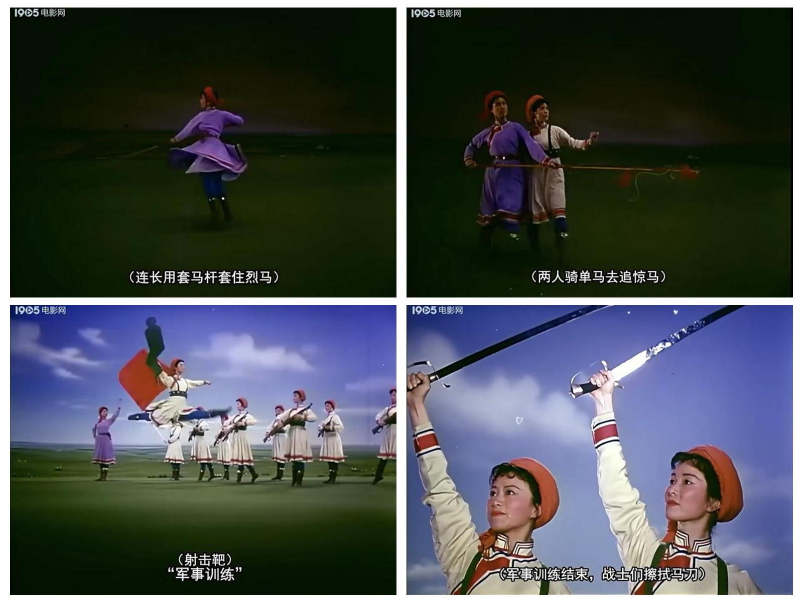 《草原女民兵》最初作為舞臺舞蹈,其美學(xué)特質(zhì)建立在現(xiàn)場性、即時性與三維空間性之上。而當(dāng)它通過《百花爭艷》的鏡頭被重新詮釋時,經(jīng)歷了一場深刻的美學(xué)轉(zhuǎn)換。電影不僅記錄了這一舞蹈,更通過其特有的語言系統(tǒng),對舞蹈進(jìn)行了二次創(chuàng)作與美學(xué)升華。
