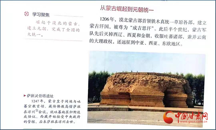在高一歷史課本第56頁中外歷史綱要(上)第三單元有一段記錄“涼州會(huì)談”的簡要文字:“1247年,蒙古皇子闊端與吐蕃宗教首領(lǐng)、藏傳佛教高僧薩班在涼州會(huì)談,就吐蕃地區(qū)歸附達(dá)成協(xié)議。西藏開始接受中央政府的管轄。后來薩班在涼州去世。”文字右上角是一張薩班靈骨塔遺址配圖。