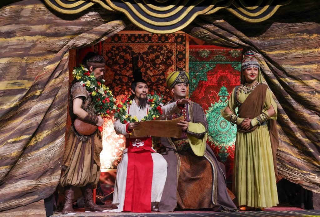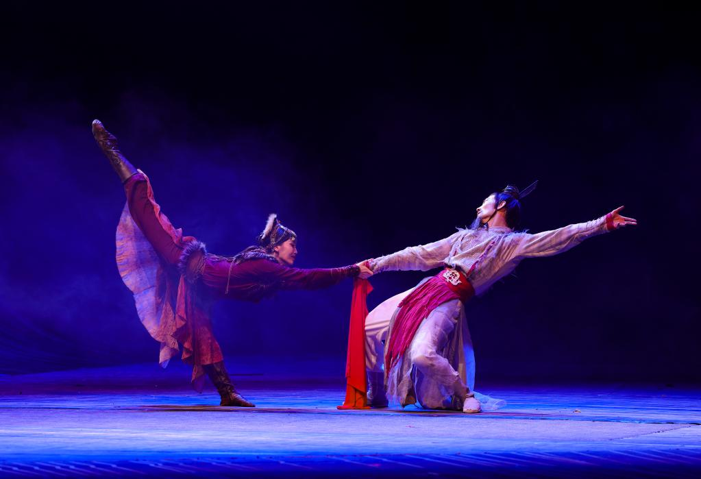 10月27日晚,在烏魯木齊文化中心大劇院,演員在舞劇《張騫》中表演。 10月27日晚,以漢代張騫出使西域為藍(lán)本創(chuàng)作的重大歷史題材舞劇《張騫》,在烏魯木齊文化中心大劇院首演。該劇由《授節(jié)》《守節(jié)》《傳節(jié)》《使節(jié)》四幕組成,演繹了張騫出使西域的“鑿空之旅”,展現(xiàn)了各民族廣泛交往、全面交流、深度交融的生動場景。 新華社記者 王菲 攝