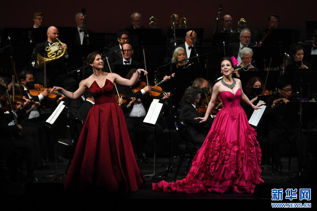 11月13日,在美國紐約林肯中心,女高音歌唱家埃絲特·莫琳·凱莉(前左)與花腔女高音歌唱家霍莉·弗萊克(前右)表演根據(jù)中國古詩詞改編的歌曲《詠鵝·詠雪》。新華社記者 李睿 攝