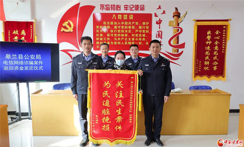 “沒想到還能追回被騙的錢,真心感謝皋蘭縣公安局的民警們。”返還儀式上,楊女士領回被騙資金,連聲道謝,并向辦案民警送上了一面印有“關注民生案件 為民追贓挽損”的錦旗,感謝民警全力偵辦案件,為自己挽回損失。