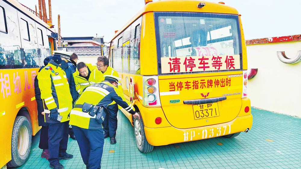 民警在檢查幼兒園校車。開學(xué)在即,為保障學(xué)生上下學(xué)乘車安全,2月18日,臨潭縣公安局交警大隊(duì)聯(lián)合縣交通運(yùn)輸局對校車開展“安全體檢”。 新甘肅·甘肅法治報(bào)記者金凡裕攝
