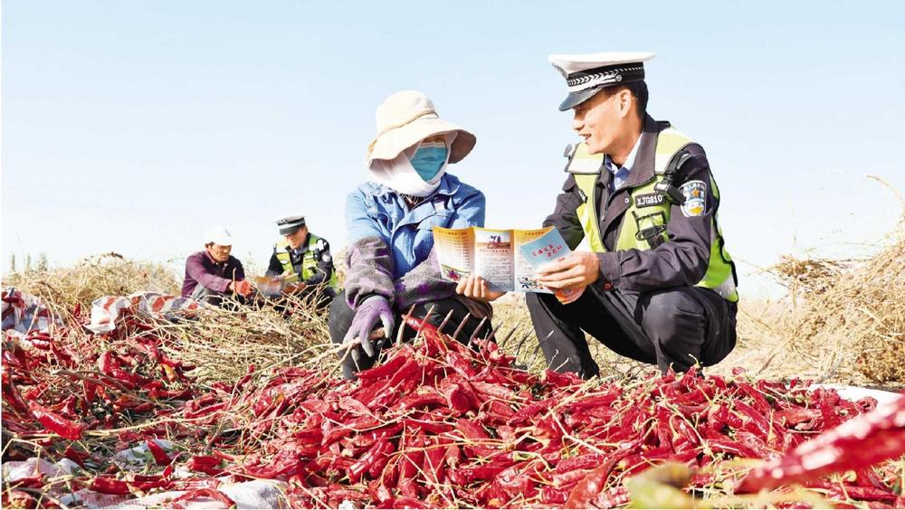 民警在田間地頭向群眾講解交通安全知識。近日,高臺縣公安局交通管理大隊駱駝城交警中隊民輔警通過發(fā)放宣傳資料、以案釋法、與村民面對面交流等方式,宣傳道路交通安全法律法規(guī),維護好豐收季節(jié)農(nóng)村道路交通秩序。新甘肅·甘肅法治報通訊員 蔣雯麗 攝