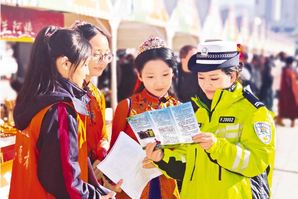 民警向群眾講解交通安全知識(shí)。11月27日,廣河縣公安局交管大隊(duì)民警走進(jìn)齊家文化廣場,利用戲曲進(jìn)鄉(xiāng)村文藝匯演的有利契機(jī)開展交通安全系列宣傳活動(dòng)。新甘肅·甘肅法治報(bào)通訊員 汪洋 攝