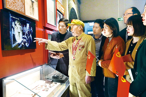圖為江蘇省宜興市紀檢監(jiān)察干部參觀黨史陳列館,聆聽有65年黨齡的老黨員講述抗戰(zhàn)經歷。鄒宜賓 攝