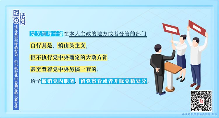 《中國共產(chǎn)黨紀律處分條例》第五十六條第一款規(guī)定,黨員領(lǐng)導(dǎo)干部在本人主政的地方或者分管的部門自行其是,搞山頭主義,拒不執(zhí)行黨中央確定的大政方針,甚至背著黨中央另搞一套的,給予撤銷黨內(nèi)職務(wù)、留黨察看或者開除黨籍處分。