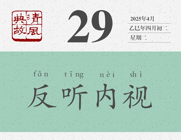 后人將“反聽之謂聰,內(nèi)視之謂明”縮減為“反聽內(nèi)視”四個(gè)字,并以此為典提醒人們,對外要虛心聽取別人的批評意見,對內(nèi)要及時(shí)反省自己的所作所為?!逗鬂h書·王允傳》:“夫內(nèi)視反聽,則忠臣竭誠;寬賢矜能,則義士厲節(jié)。”