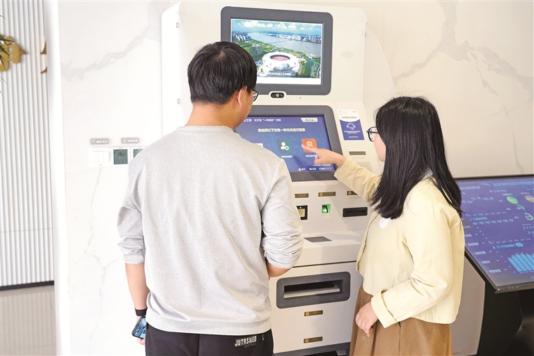 5月10日,浙江省平湖市林埭鎮(zhèn)徐家埭村的數(shù)智生活館內(nèi),村民在工作人員的幫助下,使用政務服務長三角“一網(wǎng)通辦”終端辦理業(yè)務。金苗 攝