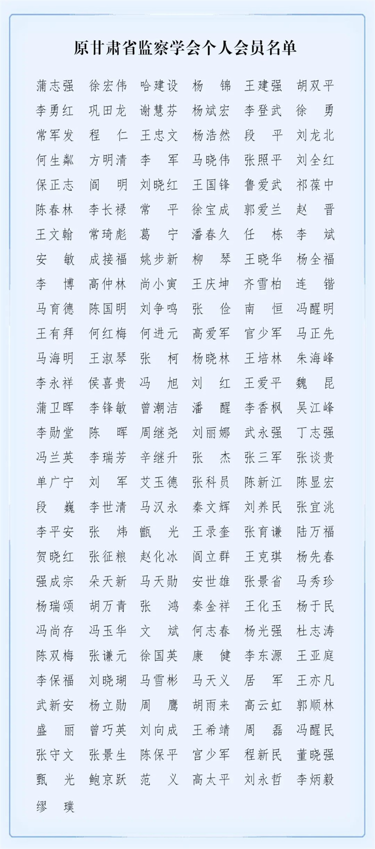 原甘肅省監(jiān)察學(xué)會已于2024年5月更名為“甘肅省紀(jì)檢監(jiān)察協(xié)會”。為推動更名換屆后的甘肅省紀(jì)檢監(jiān)察協(xié)會輕裝上陣,更好服務(wù)紀(jì)檢監(jiān)察工作大局,按照協(xié)會第五屆理事會第二次會議精神,決定對原甘肅省監(jiān)察學(xué)會個人會員和單位會員進(jìn)行清理,現(xiàn)就有關(guān)事項(xiàng)公告如下: