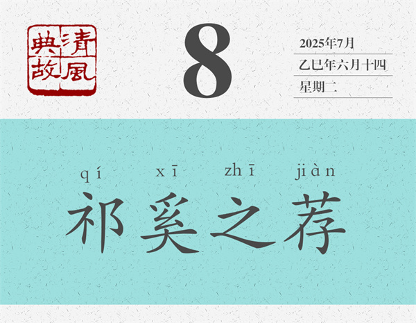 左丘明認(rèn)為,祁奚才是真正能舉薦賢能的人:“稱其仇,不為諂;立其子,不為比;舉其偏,不為黨。”意思是,祁奚推舉他的仇人,不是為了諂媚;推薦自己的兒子,不是出于偏愛(ài);推薦自己的下屬,不是為了結(jié)黨營(yíng)私?!秴问洗呵铩贩Q:“外舉不避仇,內(nèi)舉不避子,祁黃羊可謂公矣。”后世即以“祁奚之薦”為典,形容舉薦人才心胸開闊,公正無(wú)私。唐人姚元崇《答張九齡書》:“歷官三朝,年逾一紀(jì),凡所稱薦,罕避嫌疑,實(shí)有祁奚之舉。”