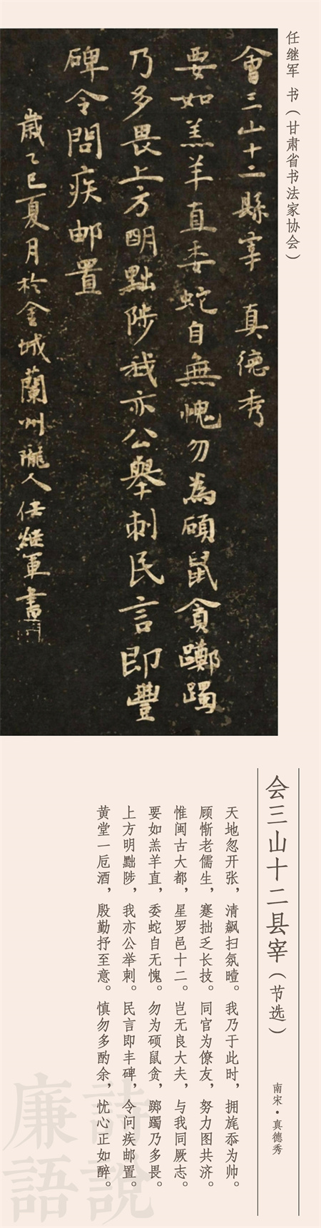 公元1232年,南宋官員真德秀到福州擔(dān)任知府,到任后把下轄12個(gè)縣的知縣召集在一起集體談話,擺事實(shí)、講道理,談廉政、申紀(jì)律,事后將談話內(nèi)容寫成了詩,就是今天我們看到的這首作品。這是一首五言敘事詩,長(zhǎng)達(dá)250字,這里我們節(jié)選后半部分。