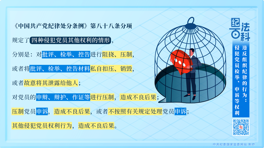 《中國(guó)共產(chǎn)黨紀(jì)律處分條例》第八十八條分項(xiàng)規(guī)定了四種侵犯黨員其他權(quán)利的情形,分別是:對(duì)批評(píng)、檢舉、控告進(jìn)行阻撓、壓制,或者將批評(píng)、檢舉、控告材料私自扣壓、銷(xiāo)毀,或者故意將其泄露給他人;對(duì)黨員的申辯、辯護(hù)、作證等進(jìn)行壓制,造成不良后果;壓制黨員申訴,造成不良后果,或者不按照有關(guān)規(guī)定處理黨員申訴;其他侵犯黨員權(quán)利行為,造成不良后果。