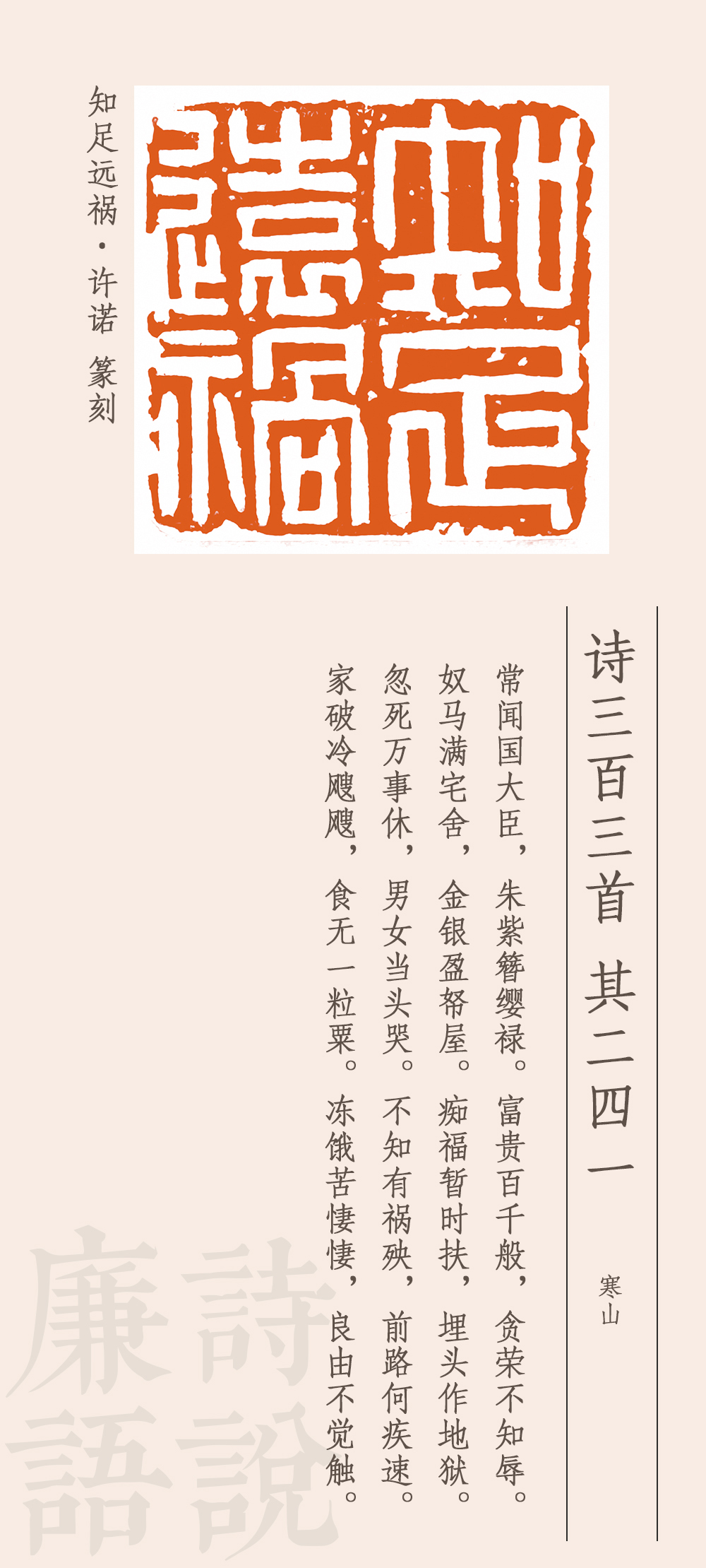 這首詩是諷刺高官貪圖富貴、聚斂財物的。他說,有些國之大臣,穿戴尊榮,好不威風(fēng),享受千般榮華富貴,卻一點兒都不顧及廉恥榮辱,家中擁有大量駿馬奴仆,屋子里堆滿金銀財寶,自以為這是在享福,其實是在給自己挖墳?zāi)沟鬲z。一旦死去,萬事皆休,富貴是無法永久保留的。如果因貪腐而遭受禍殃,那下場就會很慘。家破人亡,挨凍受餓,凄風(fēng)苦雨,苦不堪言。最后一句卒章顯志:之所以會有這樣的遭遇和結(jié)局,是因為沒有悟透取禍的原因。這個原因從前面所述來看,就是太貪婪、不知足。