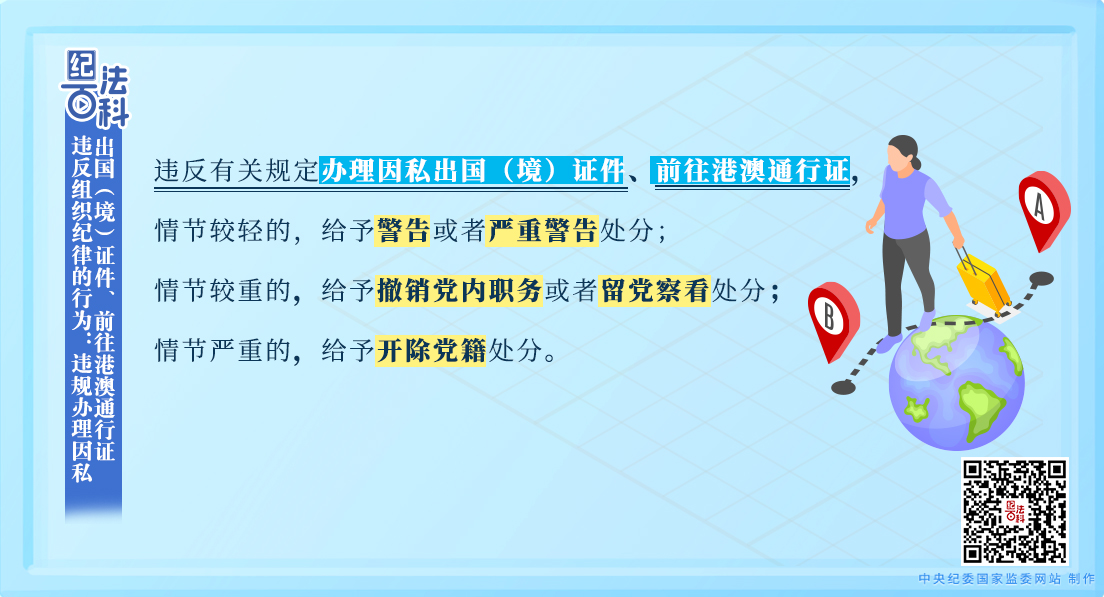 《中國(guó)共產(chǎn)黨紀(jì)律處分條例》第九十一條規(guī)定:“違反有關(guān)規(guī)定辦理因私出國(guó)(境)證件、前往港澳通行證,或者未經(jīng)批準(zhǔn)出入國(guó)(邊)境,情節(jié)較輕的,給予警告或者嚴(yán)重警告處分;情節(jié)較重的,給予撤銷黨內(nèi)職務(wù)或者留黨察看處分;情節(jié)嚴(yán)重的,給予開除黨籍處分。”