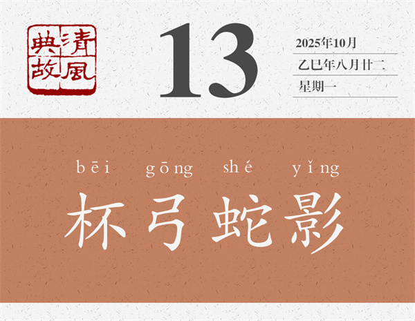 樂(lè)廣想,哪有這回事呢?當(dāng)時(shí),河南聽(tīng)事堂墻壁上掛著一張弓,上面用漆畫(huà)著一條蛇。樂(lè)廣就想,這位朋友所見(jiàn)杯中之蛇,是不是這張弓的影子呢?于是,復(fù)原了上次喝酒的現(xiàn)場(chǎng),讓客人坐在原來(lái)的位置上,將酒杯放在原來(lái)的地方上,問(wèn)他“酒中復(fù)有所見(jiàn)不”,客人說(shuō)“所見(jiàn)如初”。樂(lè)廣這才告訴他,杯中之蛇只是角弓之影而已??腿擞谑?ldquo;豁然意解,沉疴頓愈”。后世即以“杯弓蛇影”為典,比喻疑神疑鬼,自相驚擾。明人袁宏道詩(shī)《病中和黃道元至日禪寺夢(mèng)悉詩(shī)》:“消愁莫問(wèn)弓蛇影,對(duì)境聊觀(guān)夢(mèng)幻身。”