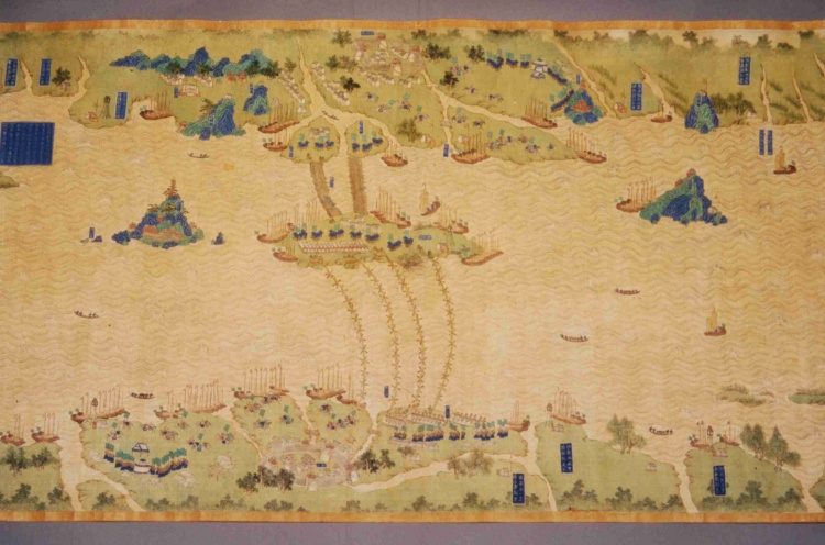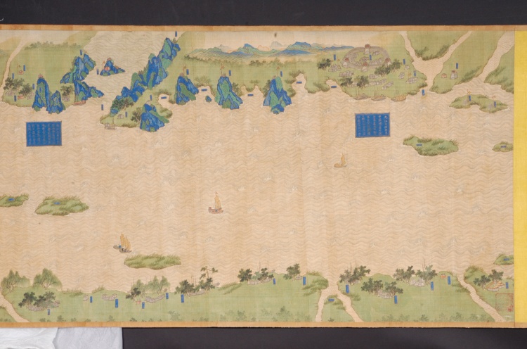 清代,縱59.7厘米,橫1340厘米。采用傳統(tǒng)技法繪制,上南下北,凡江水、港泊、洲渚、城池、村落、林木、山石、舟車、人物、旗幡、軍械均以立體形象呈現(xiàn),飾以石青、石綠等多種顏色。上起九江、下至鎮(zhèn)江,千里區(qū)域中列攔江纜、攔江牌、戰(zhàn)船、木樓、煙墩、駐軍地、營(yíng)等各種軍事設(shè)施,每營(yíng)均有金書大榜題,記述本營(yíng)所處位置及兵力布置狀況,每汛的標(biāo)題上還記有汛與汛之間的里數(shù)。