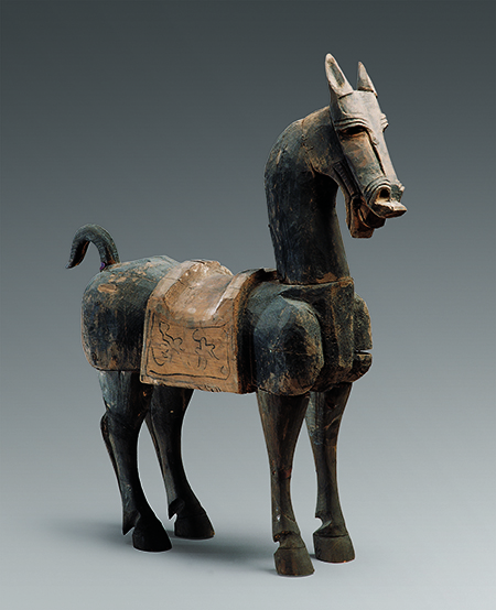 漢代,武威市磨嘴子漢墓出土。高87厘米,長72厘米。木馬形體高大,張嘴嘶鳴,四足直立,作佇立狀。通體涂黑,用刀刻出眼、鼻、唇,尾后舉下垂。馬鞍用白粉涂底,上以黑色勾畫出云氣紋。整體造型雄渾質(zhì)樸,生動傳神。