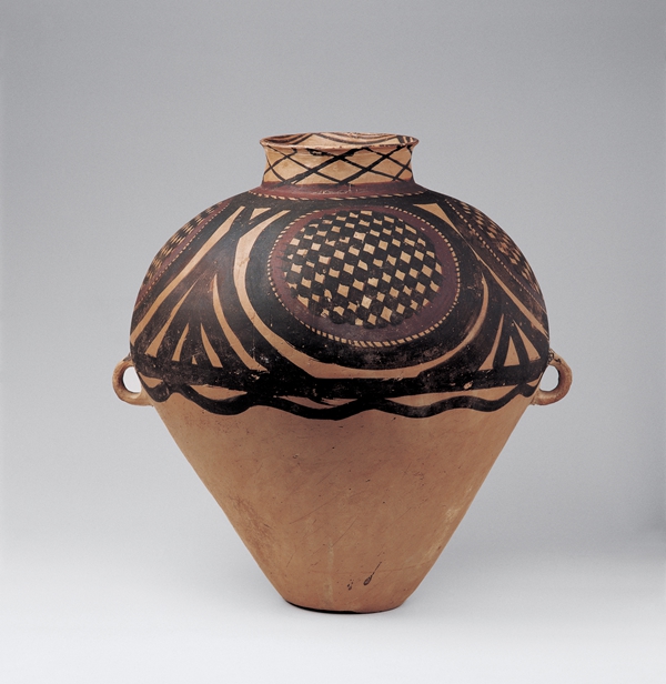 馬廠類型,蘭州市土谷臺出土。口徑13.9厘米,底徑12厘米,高44.5厘米。泥質橙黃陶。施黑,紅彩,口內繪一圈帶紋和連弧紋,頸部繪菱格紋,肩腹部用黑紅兩色繪二方連續(xù)的四大圓圈紋,圓圈內填方格紋。腹中部繪黑色帶紋和一圈水波紋。四大圓圈紋,顯示了馬廠類型彩陶的獨特文化風格。